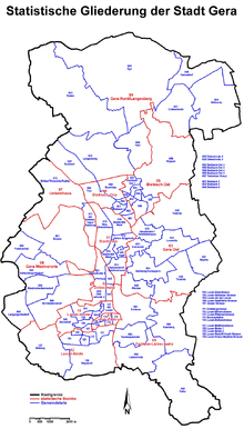 Gera is divided in different ways. Historically, there are more than 60 villages in the densely settled Elster valley area belonging to Gera today. The actual division knows on the one hand statistical districts and on the other hand political districts. The 12 statistical districts are covering the whole city area and consist of (sometimes) several political districts, urban quarters and/or rural villages. The 16 political districts are covering only few parts of Gera, but not the central urban areas, instead usually rural districts got incorporated during the second half of the 20th century. Each political district can (but doesn't have to) consist of more than one village. Each political district elects an own district council and a district mayor, whereas the statistical districts don't have any political function.