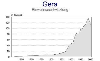 Gera is the third-largest city in Thuringia, Germany, with 94,000 inhabitants, located 55 kilometres (34 miles) south of Leipzig, 75 km (47 miles) east of Erfurt and 120 km (75 miles) west of Dresden.