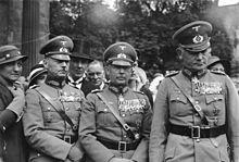Rundstedt's Corps disintegrated in the wake of defeat and the German Revolution, but while most officers were demobilised, he remained in the Army, apparently at the request of General Wilhelm Groener, who assumed leadership of the shattered Army. He briefly rejoined the General Staff, but this was abolished under the terms of the Treaty of Versailles, signed in June 1919. In October Rundstedt was posted to the staff of Military District (Wehrkreis) V, based in Stuttgart, under General Walter von Bergmann. He was there when the attempted military coup known as the Kapp Putsch took place in March 1920. Bergmann and Rundstedt, like most of the Army leadership, refused to support the coup attempt: Rundstedt later described it as "a failure and a very stupid one at that."[6] This was not an indication of any fondness for the Weimar Republic on Rundstedt's part – he remained a monarchist.[7] It was a reflection of his view that Army officers should not interfere in politics, and should support the government of the day, whatever its nature: a view he was to hold firmly to throughout his career. He testified at the Nuremberg Trials in 1946: "We generals did not concern ourselves with politics. We did not take part in any political discussions, and we did not hold any political discussions among ourselves."[8]