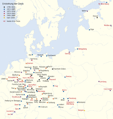The Corps sprang from the older Landsmannschaft. The name Corps came into use in 1810 at the University of Heidelberg and soon displaced the older name of Landsmannschaft at all the universities. The oldest still active Corps are the 1789 founded Guestphalia at the University of Halle, the 1798 founded Onoldia at the University of Erlangen who are both members of the KSCV and as a member of the WSC the Saxo-Montania founded also 1798 at the Bergakademie Freiberg today at the RWTH Aachen University. After the Carlsbad Decrees 1819 the Corps were exposed to harsh persecution by university and state officials just like their rivals as at the universities in Germany the Burschenschaften. After 1848, they were officially approved.[2]