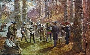 The object and purpose of the Corps was and still is solely the education of students to become a strong, free and cosmopolitan personality who is not held back by religious, racist, national, scientific or philosophical limitations of the mind. Three primary institutions within the fraternity aid with achieving this aim; including the Corpsconvent [regular council meetings of the Corps Brothers], the Kneipe [celebratory get-together of Corps Brothers with speeches, beer and songs], and today's Bestimmungsmensur [the event of academic fencing with sharp blades for the first or one of the first times], where the ones to fence are chosen on the basis of placing two equal opponents in front of each other. [...] This experience, and the intertwined need to overcome one's own fear, dedicated to the union of his Corps, and the connected strengthening of the sense of community aids the personal growth just as does taking a hit without losing one's stand and accepting the assessment of the Mensur by the own Corps Brothers.