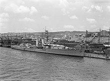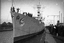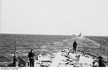 From 7 November to 15 February 1941, the ship was in dry dock for maintenance. In September, she was assigned to the Baltic Fleet, centered on the newly commissioned battleship Tirpitz; the Baltic Fleet was tasked with preventing the Soviet Navy from breaking out of the Baltic. Emden and Leipzig were the core of the southern group, which was based in Libau. The fleet remained on station only briefly,[20] and when it became clear that the Soviet fleet had remained in port, the German Baltic Fleet was dissolved. On 16 September, Emden was operating off Dagö with Leipzig and three torpedo boats; the ships came under fire from Soviet coastal batteries, but were undamaged. A group of four Soviet torpedo boats also made an unsuccessful attack on the German squadron.[21] Emden again provided gunfire support to German troops fighting on the Sworbe Peninsula from 26 to 27 September. Later on the 27th, the ship was transferred to Gotenhafen. She was assigned to the newly formed Training Unit of the Fleet in November 1941, and she would remain attached to the unit for the rest of the war. From June to November 1942, the ship was thoroughly overhauled in Wilhelmshaven, before returning to Gotenhafen on 7 November. Raeder again came aboard the ship for the voyage back to Gotenhafen; this was his last visit to a warship before his resignation.[22]