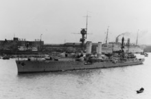 Emden was laid down at the Reichsmarinewerft shipyard in Wilhelmshaven on 8 December 1921. Political instability and Germany's financial weakness in the early 1920s delayed construction of the ship, and she was launched on 7 January 1925. Admiral Hans Zenker gave a speech at her launching, and the ship was christened by the widow of Karl von Müller, who had commanded the original Emden during World War I. The new cruiser was commissioned into the fleet nine months later, on 15 October 1925. Intended for use as a training ship for naval cadets, Emden was assigned to the Marinestation der Nordsee (North Sea Naval Station); she began sea trials after entering service, and these were interrupted with alterations in the Reichsmarinewerft that included a reconstruction of the battle mast. After these were completed in 1926, she conducted individual training and made numerous visits to foreign ports in northern European waters. In August and September 1926, she took part in annual fleet maneuvers, and in October she returned to the shipyard again to have her aft funnel increased in height to match the forward one. Emden was at that time allocated to the Training Inspectorate of the Navy.[10]