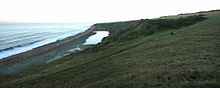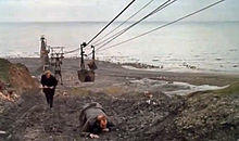 Carter's climactic pursuit of Eric used an amalgamation of two locations spaced 35 miles (56 km) apart: Blyth staithes and Blackhall Beach near Blackhall Colliery.[59][60] The chase scene was shot in reverse, with Hodges filming Eric's death scene first because of Hendry's poor condition, Hodges being worried that he would be too out of breath to play the death scene after running. Hodges chose the beach for its bleak, dark atmosphere but when he returned to shoot the scene he found it bathed in bright sunshine, unsuitable for the sombre conclusion he was hoping for. He waited hours until the sun began setting to capture the overcast shadowy lighting seen in the film.[61] The film shows the beach black with coal spoilings, dumped there by the mine's conveyor system. The conveyor, a common sight on the East Durham coast, was known locally as 'The Flight'. In the early 2000s, £10 million was spent removing these conveyors and the concrete towers, and cleaning tons of coal waste from the beaches of East Durham. The cleaning programme was known as 'Turning the Tide'.[62]