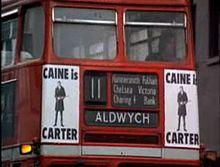 The film's premiere was held in Los Angeles on 3 February 1971, with a preview held in New York on 3 March.[73] The film finally opened for general release across the UK on 10 March 1971 and in the US on 18 March, where it was rated 'X' for violence and female nudity, meaning it was for adults only.[74] It was later reclassified as 'R', meaning children under the age of 17 had to be accompanied by an adult.[12] A censored edited version was released in West Germany on 6 August 1971, with a running time nine minutes shorter than the original. Michael Klinger was involved in promotion of the film in the UK, using the experience from his background as a distributor to conduct a strong advertising campaign. Teaser posters for the film appeared on the front of buses across London, featuring the tag-line "Caine is Carter".[2]