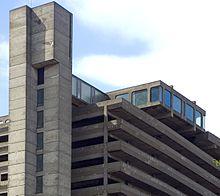 Locations along the east coast of England had been scouted by Hodges and Klinger in the spring of 1970, to find a landscape that suggested a "hard, deprived background".[7] Newcastle was selected after Hodge's first choice of Hull proved to be unsuitable.[7][38] Hodges thoroughly researched the local Newcastle crime scene, adapting the script to make use of settings and incorporating elements of his research into the story.[36] His background at World in Action had made him accustomed to making films based on hard investigation and this informed his approach to Get Carter.[2][35] One of the first locations which attracted Hodge's attention was the Trinity Square multi-storey car park, which dominated the centre of Gateshead. To Hodges, the car park and the cast iron bridges over the Tyne, "seemed to capture the nature of Jack Carter himself".[39] The car park symbolises one of the film's more subtle themes, which is the destruction of an old cityscape and its rebuilding in line with modern Brutalism.[42] Hodges described how wandering alone through the upper structure, he realised how the different levels could be used to reveal the hunter, Carter, and the hunted, Brumby, simultaneously but without either being aware of the other – adding to the suspense.[39] The shopping centre and car park were closed in early 2008, and demolished in late 2010.[43]