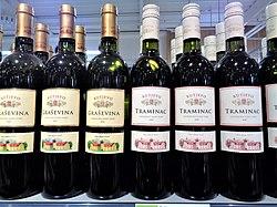Gewürztraminer (German: [ɡəˈvʏʁtstʁaˈmiːnɐ]) is an aromatic wine grape variety, used in white wines, and performs best in cooler climates. In English, it is sometimes referred to colloquially as Gewürz (/ɡəˈvʊərts, -ˈvɜːrts/; although this is never the case in German, because "Gewürz" means "herb" or "spice"), and in French it is written Gewurztraminer (without the umlaut). Gewürztraminer is a variety with a pink to red skin colour, which makes it a "white wine grape" as opposed to the blue to black-skinned varieties commonly referred to as "red wine grapes". The variety has high natural sugar and the wines are white and usually off-dry, with a flamboyant bouquet of lychees. Indeed, Gewürztraminer and lychees share the same aroma compounds.[1] Dry Gewürztraminers may also have aromas of roses, passion fruit and floral notes. It is not uncommon to notice some spritz (fine bubbles on the inside of the glass).