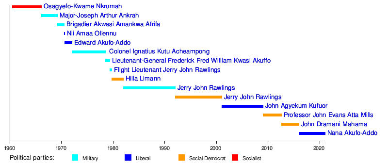 Nana Akufo-Addo, the ruling party candidate, was defeated in a very close election by John Atta Mills of the National Democratic Congress (NDC) following the Ghanaian presidential election, 2008.[58][59] Mills died of natural causes and was succeeded by vice-president John Dramani Mahama on 24 July 2012.[60]