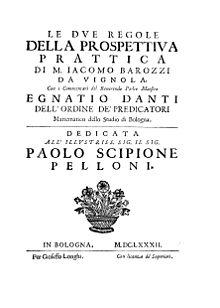 His two published books helped formulate the canon of classical architectural style. The earliest, Regola delli cinque ordini d'architettura ["Canon of the five orders of architecture"] (first published in 1562, probably in Rome), presented Vignola's practical system for constructing columns in the five classical orders (Tuscan, Doric, Ionic, Corinthian and Composite) utilising proportions which Vignola derived from his own measurements of classical Roman monuments.[6] The clarity and ease of use of Vignola's treatise caused it to become in succeeding centuries the most published book in architectural history.[7] Vignola's second treatise, Due regole della prospettiva pratica ["Two rules of practical perspective"], published posthumously with extensive commentary by the mathematician Ignazio Danti (Bologna 1583), favours one-point perspective rather than two-point methods such as the bifocal construction. Vignola presented— without theoretical obscurities— practical applications which could be understood by a prospective patron.[8]