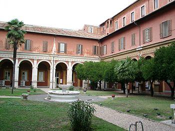 - The main courtyard of the Pontifical University of Saint Thomas Aquinas, Angelicum, formerly the convent of the Church of Santi Domenico e Sisto, is traditionally attributed to Vignola but completed after his death. Ten arches on the long sides and seven on the short are sustained by pilasters with Tuscan style ornamentation that rise from high plinths. A simple frieze with smooth triglyphs and metopes separates the lower from the upper levels.[4]