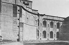 - Palazzo Farnese, Piacenza. This was a grandiose project of a vast palace on a scale paralleled only by the Vatican Palace in Italy; the rectangular plan is circa 111 metres by 88 metres. The actual construction, however, made up only less than a half of Vignola's original project and lacked many of the planned architectural features; missing elements include part of the exterior surrounding walls, the main façade, modelled on the ancient triumphal arch and with a large tower, and a theater in the large inner courtyard.