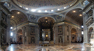Bernini was also a leading figure in the emergence of Roman Baroque architecture along with his contemporaries, the architect Francesco Borromini and the painter and architect Pietro da Cortona. Early in their careers they had all worked at the same time at the Palazzo Barberini, initially under Carlo Maderno and, following his death, under Bernini. Later on, however, they were in competition for commissions, and fierce rivalries developed, particularly between Bernini and Borromini.[8][9] Despite the arguably greater architectural inventiveness of Borromini and Cortona, Bernini's artistic pre-eminence, particularly during the reigns of popes Urban VIII (1623–44) and Alexander VII (1655–65), meant he was able to secure the most important commissions in the Rome of his day, the various massive embellishment projects of the newly finished St. Peter's Basilica, completed under Pope Paul V with the addition of Maderno's nave and facade and finally re-consecrated by Pope Urban VIII on 18 November 1626, after 150 years of planning and building. Bernini's design of the Piazza San Pietro in front of the Basilica is one of his most innovative and successful architectural designs. Within the basilica he is also responsible for the Baldacchino, the decoration of the four piers under the cupola, the Cathedra Petri or Chair of St. Peter in the apse, the chapel of the Blessed Sacrament in the right nave, and the decoration (floor, walls and arches) of the new nave.
