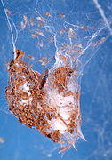 At least 60 spiderlings emerge from an egg sac. Unusual for spiders, they are subsocial at this stage: they remain together for about a month, but do not cooperate in prey capture. The amount of cannibalism correlates with the amount of available food.[12] E. atrica molts seven or eight times before reaching the immature adult state, and after a final molt reaches maturity.[13]
