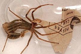 The giant house spider has been treated as either one species, under the name Eratigena atrica, or as three species, E. atrica, E. duellica and E. saeva. As of April 2020, the three species view was accepted by the World Spider Catalog. They are among the largest spiders of Central and Northern Europe. They were previously placed in the genus Tegenaria. In 2013, they were moved to the new genus Eratigena as the single species Eratigena atrica.[2] In 2018, the three separate species were restored.[3] The bite of these species does not pose a threat to humans or pets, and they are generally reluctant to bite, preferring instead to hide or escape.
