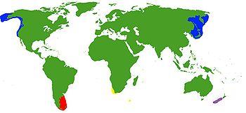 Species in the genus Enteroctopus are restricted to the temperate areas of the Northern and Southern Hemispheres. E. dofleini is the only member of the genus found in the Northern Hemisphere, and also the most widely distributed: It is found from Southern California, along the North Pacific Rim to Japan, including the Okhotsk and Bering Seas.[1] The other three species are found in the Southern Hemisphere; E. megalocyathus occurs on the southeastern coast of South America,[4] E. magnificus on the southwestern coast of Africa from Namibia to Port Elizabeth, South Africa, and E. zealandicus in temperate New Zealand.[2]