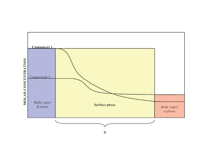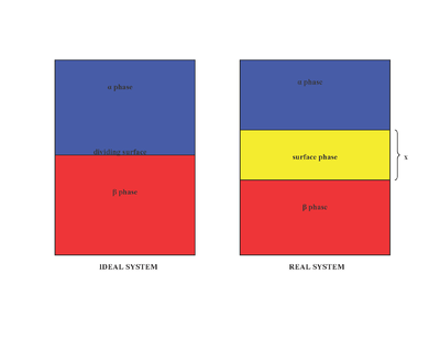 In the presence of two phases (α and β), the surface (surface phase) is located in between the phase α and phase β. Experimentally, it is difficult to determine the exact structure of an inhomogeneous surface phase that is in contact with a bulk liquid phase containing more than one solute.[2] Inhomogeneity of the surface phase is a result of variation of mole ratios.[1] A model proposed by Josiah Willard Gibbs proposed that the surface phase as an idealized model that had zero thickness. In reality, although the bulk regions of α and β phases are constant, the concentrations of components in the interfacial region will gradually vary from the bulk concentration of α to the bulk concentration of β over the distance x. This is in contrast to the idealized Gibbs model where the distance x takes on the value of zero. The diagram to the right illustrates the differences between the real and idealized models.