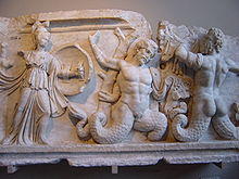 Archaic and Classical representations show Gigantes as man-sized hoplites (heavily armed ancient Greek foot soldiers) fully human in form.[4] Later representations (after c. 380 BC) show Gigantes with snakes for legs.[5] In later traditions, the Giants were often confused with other opponents of the Olympians, particularly the Titans, an earlier generation of large and powerful children of Gaia and Uranus.