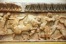 - Lion or Leon: Possibly a Giant, he is mentioned by Photius (as ascribed to Ptolemy Hephaestion) as a giant who was challenged to single combat by Heracles and killed.[206] Lion-headed Giants are shown on the Gigantomachy frieze of the second century BC Pergamon Altar.[207]