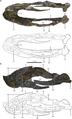 Both angular and articular-surangular-coronoid (ASC) complex are comparatively smaller than the dentary. The angular is firmly fused to the ASC complex and gives form to the lower margin of the external mandibular fenestra. The angular has a bowed shape and is mainly forwards extended with a large lateral depression that joints with the posterior lower process (bony projection/extension) of the dentary. The ASC complex is composed by the fusion of the articular and surangular bones with the coronoid process of the mandible. This complex extends forwards to articulate with the posterior upper process of the dentary and gives form to the upper margin of the external mandibular fenestra. The coronoid process prominence is low and distinctively rounded. On the posterior end of the mandibles the articular glenoid can be located. It is relatively large, convex, and bowl-shaped.[3]