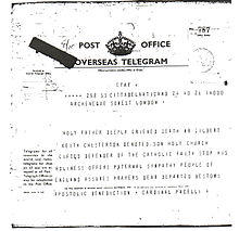 Chesterton died of congestive heart failure on the morning of 14 June 1936, at his home in Beaconsfield, Buckinghamshire. His last known words were a greeting spoken to his wife. The homily at Chesterton's Requiem Mass in Westminster Cathedral, London, was delivered by Ronald Knox on 27 June 1936. Knox said, "All of this generation has grown up under Chesterton's influence so completely that we do not even know when we are thinking Chesterton."[27] He is buried in Beaconsfield in the Catholic Cemetery. Chesterton's estate was probated at £28,389, approximately equivalent in 2012 terms to £1.3 million.[28]
