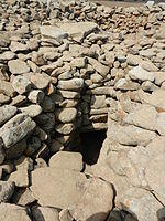 The name Rujm el-Hiri, "stone heap of the wild cat",[2] was originally taken from Syrian maps.[6] The term rujm in Arabic (pl. rujum; Hebrew: rogem) can also refer to a tumulus, a heap of stones underneath which human burial space was located.[1] The name is sometimes romanized as Rujm Hiri or Rujum al-Hiri.