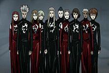 The most charismatic and prominent member of Gilgamesh, Novem (Nine) is the kind blond who eventually captures Kiyoko's heart. He has blue eyes and short hair with a fringe usually covering his right eye. He remains calm at all times, and generally takes a position equivalent to leader, giving the orders to his team members. Novem genuinely believes that Gilgamesh has a sacred purpose, regardless of the lives taken to get to that end. In the battle with Kazamatsuri's Blattaria where his teammates die, Novem is shot with a substance which converts anti-matter to matter, which grievously injures him. Falling unconscious, he is found by Kiyoko who tries to heal him. With Kiyoko as the mother, Novem is the father of a very short-lived new human race. He confesses to Tatsuya "Your sister.... I did love her" before his death. His tattoo is on his left shoulder.