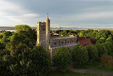 The Parish Church of St Mary Magdalene ("The Church on the Green",[22]) is the oldest building in Gillingham and Grade II* Listed.[23] The Normans built the church in the early 13th century, then in the 15th century a tower was added. More extensions were added during the 14th century. In 1700, Philip Wightman was commissioned to cast and hang a ring of five bells, to the tower. Then in 1737, Richard Phelps added another bell to complete a ring of six.[24] Edward Hasted refers to it in 1798, ‘three isles and three chancels, with a handsome tower steeple at the west end’'.[25] In 1811, Thomas Mears added two treble bells to make eight. In 1868, architect Sir Arthur Blomfield restored the church and tower and to mark the completion of the restoration, the firm of Heaton, Butler and Bayne replaced the stained glass in the east window.[24] Based on a design by Henry Holiday.[23]