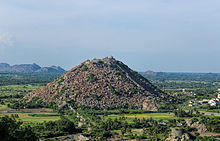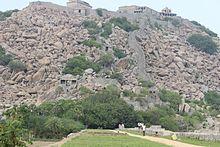 The third fort for some reason is called Chakkiliya Durg or Chamar Tikri — meaning the fort of the Chamars. It is not known why it had acquired the name. Probably the royal Chamar warriors used to stay here, as Gingee obviously was a military encampment. There is a smaller and less important fourth hill, the summit of which is also well fortified. There is nothing much left of Chandrayan Durg and Chakkilli Durg. Their flanks are now completely covered with thorny shrubs and stone pieces.[5]