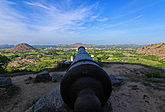 A panorama of the Senji fort with the Kalyana Mahal visible just right of centre | |