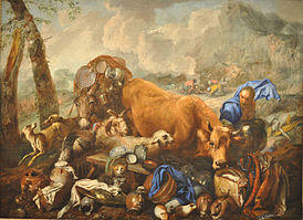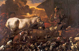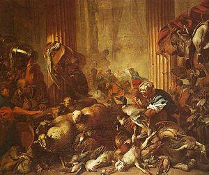 Castiglione was renowned for his ability to paint animals, mostly barn animals, and this was often a dominant motif in his paintings. For example, in the painting of Jesus clearing the temple of Moneylenders, the religious event is a minor, background part of the painting, the stampede of animals is far more prominent than the scattering of bankers. Castiglione's attention to detail in the depiction of nature is regarded as proof of the influence of Scorza and the Flemish still life and animal painter Jan Roos who was a long-term resident of Genoa.[6] It has been suggested that it was Jan Roos who convinced Castiglione to enliven his religious and mythological compositions with animal and still life elements.[7]