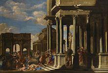 In Mantua, he received his name of Grechetto, from the classic air of his pastoral depictions. In his later years, he was severely afflicted by gout.[8] His brother Salvatore and his son Francesco excelled in the same subjects; and it is thought that many paintings which are ascribed to Benedetto are only copies after him, or perhaps originals by his son or brother.[4][9] He also influenced Anton Maria Vassallo (c1640-60).[2] Among those who engraved after him were Giovanni Lorenzo Bertolotto in Genoa,[10] the Venetian Anton Maria Zanetti, Michele l'Asne, Louis de Chatillon, and Coreneille Coemans.[11]