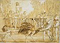 The same protagonist featured in frescos (1759-1797) in his villa di Zianigo near Mirano. These frescoes were detached and nearly sold to be sold in France, but the then Minister of Public Education, blocked the export and acquired them for the city of Venice. Since 1936, they have been on display, in a near replica of the original arrangement, in the Ca Rezzonico Museum on the Grand Canal. The frescoes have undergone recent restoration.[1] The scenes depict often cryptic events, part genre and part epic-farce, of crowds of Pulcinellos at play and work, as well as a carnival scene. The genre thematic and humor are strikingly different from the grand epic apotheoses painted his father.