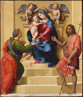 Bugiardini has long been criticized as a mediocre talent incapable of understanding the formal principles of Michelangelo, Raphael, Leonardo and Fra Bartolomeo, all major influences on his work.[2] Michelangelo himself wrote that Bugiardini was a "good person but a simple man," and Vasari claimed that Michelangelo was envious of Bugiardini since he was happy with what little skill he had, in contrast to Michelangelo was never satisfied with his works.[5] Other scholars have commended Bugiardini's color and light and the stark simplicity in many of his works. The Virgin and Child with Saints Mary Magdalene and John the Baptist (circa 1523) at the Metropolitan Museum of Art, widely regarded as one of Bugiardini's most successful creations, is so refined that it was once considered to be by Fra Bartolomeo.[6][1]