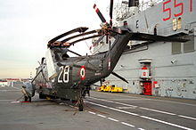 The air arm consists of a maximum of sixteen AV-8B Harrier IIs and two search and rescue helicopters, or eighteen Agusta helicopters or a mix of helicopters and fighters. The flight deck is the characteristic off-axis design with a 6.5 degree ski-jump for STOL aircraft; it is 174 m (571 ft) long and 30.4 m (100 ft) wide.[3]