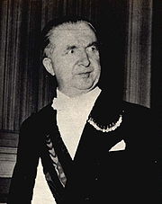 In 1954, he founded, along with Giulio Andreotti, a right-wing faction of Christian Democracy, known as "Concentration".[25] In 1955 he was one of the kingmakers of Giovanni Gronchi's election to the Presidency of the Republic, against Cesare Merzagora, who was the candidate proposed by the Christian Democratic secretary, Amintore Fanfani. Pella and Andreotti's move gained the surprising support of communist and socialist parties, as well as the one monarchist and neo-fascist movements.[26] After Gronchi's sworn in, Pella was considered the natural candidate for the premiership, however the new President of the Republic appointed Antonio Segni.