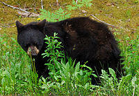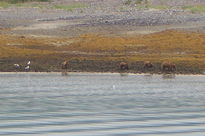 Bears, both black and brown, are seen in Glacier Bay in the intertidal zone which they frequent for foraging. They are also seen "scraping barnacles off of rocks and munching mussels." Invariably they are spotted wandering alone along the beaches of the Glacier Bay in search of salmon. The habitats of the black bears are generally the southern forested areas of the bay. However, the brown bears are mostly found in the northern, more recently glaciated zones of the Glacier Bay. Occasionally, black bears are sighted near the glaciers or near Gustavus town. Black bears with black dots and brown bears with brown dots have been seen over the last 10 years. Their travel routes have been identified as along the easy tracks such as along beaches, stream beds and river valleys. The most commonly identified locations for sighting bears in the Glacier Bay are: The Bartlett Cove, the Bartlett River, the Beardslee Islands and North and South Sandy Cove locations for black bears, while brown bears are seen to the north of Tidal Inlet in the west arm of glacier and north of Adams Inlet in the east arm. They are also seen swimming in the Bay, crossing from one bank to the other. Salmon are their favorite food, apart from bumblebees, sand fleas, bird eggs, birds, voles and marine mammal carcasses.[7][20]