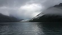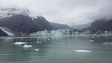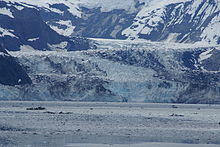 The Johns Hopkins Glacier rises from the Fairweather Range on the east slopes of Lituya Mountain and Mount Salisbury and has an easterly flow towards the head of Johns Hopkins Inlet, 1 mile (1.6 km) southwest of the terminus of Clark Glacier and 79 miles (127 km) northwest of Hoonah. Its rock, ice and snow depict a variety of impressive colors such as grey, blue and white. It was named in 1893 by H.F. Reid after the Johns Hopkins University in Baltimore, Maryland, which sponsored an expedition to this glacier. It is the only advancing tidewater glacier now (its advance started in 1924 when Grand Pacific Glacier started receding towards Tarr Inlet) and is combined with Gilman Glacier (first got attached to Hopkins in the 1990s, broke off and rejoined several times and once again it appears joined since 2000); both are advancing as one single ice block, and at the waterfront, has a width of 1 mile (1.6 km) with a depth of 250 feet (76 m), rises to a height of 250 feet (76 m) and stretches to about 12 miles (19 km) upstream. Submarine calving has also been recorded.[16][26]