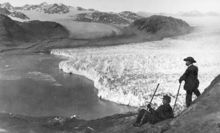 John Muir was seeking corroboration of the continental glaciation theories of Louis Agassiz, whose controversial Etudes sur les Glaciers was published in 1840.[8] The year 1893 recorded the arrival of the first tourist ship at the entrance to the Bay, at Bartlett Cove, which over the years has become central to the tourist trade in the Glacier Bay. By 1916, the Grand Pacific Glacier was at the head of Tarr Inlet, about 65 miles (105 km) from Glacier Bay's mouth. This is the fastest documented glacial retreat ever.[13] In 1925, Glacier Bay was declared a national monument.[8][11]