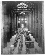 The Great Northern commissioned Samuel L. Bartlett of St. Paul, Minnesota as the architect for the Glacier Park Lodge, but Hill controlled every major aspect of the design, having temporarily stepped down from the presidency of the Great Northern to oversee the Glacier hotel projects. Hill bought 160 acres (65 ha) of land belonging to the Blackfeet Indian Reservation at what was then known as Midvale after a special act of Congress in 1912 granted him negotiating rights. The Lodge was based on the Forestry Building at the 1905 Lewis and Clark Centennial Exposition in Portland, Oregon. Both Hill and his father had admired the forestry building and duplicated its grand hall with a 48-foot (15 m) high log colonnade, each log with its bark still attached.[2]