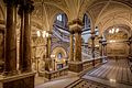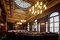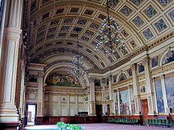 The ornate banqueting hall, which is 33.5 m (110 ft) long by 14.6 m (48 ft) wide and 15.8 m (52 ft) high, is decorated with huge murals by Scottish painters.[3] The room hosted Nelson Mandela and Sir Alex Ferguson when they received the Freedom of the City in 1993 and 1999 respectively.[3] The Council Chamber is clad Spanish mahogany paneling and its windows are made of Venetian stained glass.[3]