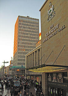 It is the replacement for the acclaimed St. Andrews Hall, adjacent to the Mitchell Library, which had been destroyed by fire in 1962, and was promoted and constructed in time for the city being recognised in the 1980s as the European City of Culture. The Concert Hall stands at the junction of Buchanan Street and Sauchiehall Street with a performers` entrance in West Nile Street, and public entrances in Buchanan street and in Killermont Street, with the RSNO Centre added in later years. The development also anticipated the adjacent major shopping mall, which opened as the Buchanan Galleries a decade later. The auditorium area is insulated by a massive rubber membrane built into the floor - damping out noise and vibration from the Subway tracks which run underneath.