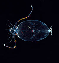 The family Cranchiidae comprises the approximately 60 species of glass squid, also known as cockatoo squid, cranchiid, cranch squid, or bathyscaphoid squid.[2] Cranchiid squid occur in surface and midwater depths of open oceans around the world. They range in mantle length from 10 cm (3.9 in) to over 3 m (9.8 ft), in the case of the colossal squid. The common name, glass squid, derives from the transparent nature of most species. Cranchiid squid spend much of their lives in partially sunlit shallow waters, where their transparency provides camouflage. They are characterised by a swollen body and short arms, which bear two rows of suckers or hooks. The third arm pair is often enlarged. Many species are bioluminescent organisms and possess light organs on the undersides of their eyes, used to cancel their shadows. Eye morphology varies widely, ranging from large and circular to telescopic and stalked. A large, fluid-filled chamber containing ammonia solution is used to aid buoyancy. This buoyancy system is unique to the family and is the source of their common name "bathyscaphoid squid", after their resemblance to a bathyscaphe. Often the only organ that is visible through the transparent tissues is a cigar-shaped digestive gland, which is the cephalopod equivalent of a mammalian liver. This is usually held in a vertical position to reduce its silhouette and a light organ is sometimes present on the lower tip to further minimise its appearance in the water.[3][4]