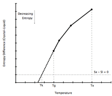 As a liquid is supercooled, the difference in entropy between the liquid and solid phase decreases. By extrapolating the heat capacity of the supercooled liquid below its glass transition temperature, it is possible to calculate the temperature at which the difference in entropies becomes zero. This temperature has been named the Kauzmann temperature.[2]