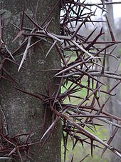 Honey locusts commonly have thorns 3–10 cm (1.2–3.9 in) long growing out of the branches, some reaching lengths over 20 cm (8 in); these may be single, or branched into several points, and commonly form dense clusters.[2] The thorns are fairly soft and green when young, harden and turn red as they age, then fade to ash grey and turn brittle when mature. These thorns are thought to have evolved to protect the trees from browsing Pleistocene megafauna, which may also have been involved in seed dispersal, but the size and spacing of them is less useful in defending against smaller extant herbivores such as deer. Thornless forms (Gleditsia triacanthos var. inermis) are occasionally found growing wild and are available as nursery plants.[2] Hybridization of honey locust with water locust (G. aquatica) has been reported.[4]