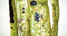 The fruit of the honey locust is a flat legume (pod) that matures in early autumn.[2] The pods are generally between 15–20 cm (6–8 in). The seeds are dispersed by grazing herbivores such as cattle and horses, which eat the pod pulp and excrete the seeds in droppings; the animal's digestive system assists in breaking down the hard seed coat, making germination easier. In addition, the seeds are released in the host's manure, providing fertilizer for them. Honey locust seed pods ripen in late spring and germinate rapidly when temperatures are warm enough.
