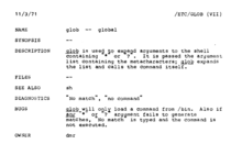 glob – the owner is dmr, short for Dennis Ritchie.The glob command, short for global, originates in the earliest versions of Bell Labs' Unix.[1] The command interpreters of the early versions of Unix (1st through 6th Editions, 1969–1975) relied on a separate program to expand wildcard characters in unquoted arguments to a command: /etc/glob. That program performed the expansion and supplied the expanded list of file paths to the command for execution.