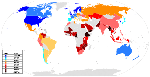 ![]() Fixed broadband Internet subscriptions in 2012 Source: International Telecommunications Union.[14]as a percentage of a country's population | ![]() Mobile broadband Internet subscriptions in 2012 Source: International Telecommunications Union.[15]as a percentage of a country's population |