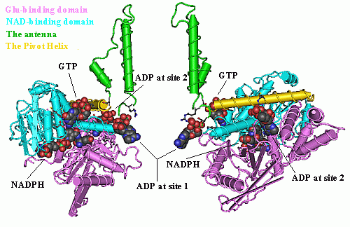 Each domain is colored differently - Glu-BD, NAD(P)-BD, antenna, the pivot helix. The allosteric regulators are shown as sphere models. This particular structure of GLUD1 is a combination of two X-ray structures - one with a bound GTP (1HWZ) and the second one with a bound ADP (1NQT). Although not real, this structure shows the relative position of the allosteric effectors when bound to GLUD1. NADPH and Glu are shown as well.