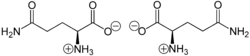 Glutamine can exist in either of two enantiomeric forms, L-glutamine and D-glutamine. The L-form is found in nature. Glutamine contains an α-amino group which is in the protonated −NH3+ form under biological conditions and a carboxylic acid group which is in the deprotonated −COO− form, known as carboxylate, under physiological conditions.
