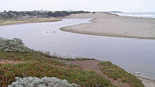 During the summer months, a sandbar is built up along the beach and separates the Russian River from the Pacific Ocean. This sandbar is breached whenever the water levels reach heights between 4.5–7 feet (1.4–2.1 m) at the Jenner visitor center.[2] Breaching of the sandbar during late fall/early winter splits the beach in two sections. The northern section is protected by the Russian River flowing into the ocean and creates an ideal location for harbor seal pupping.